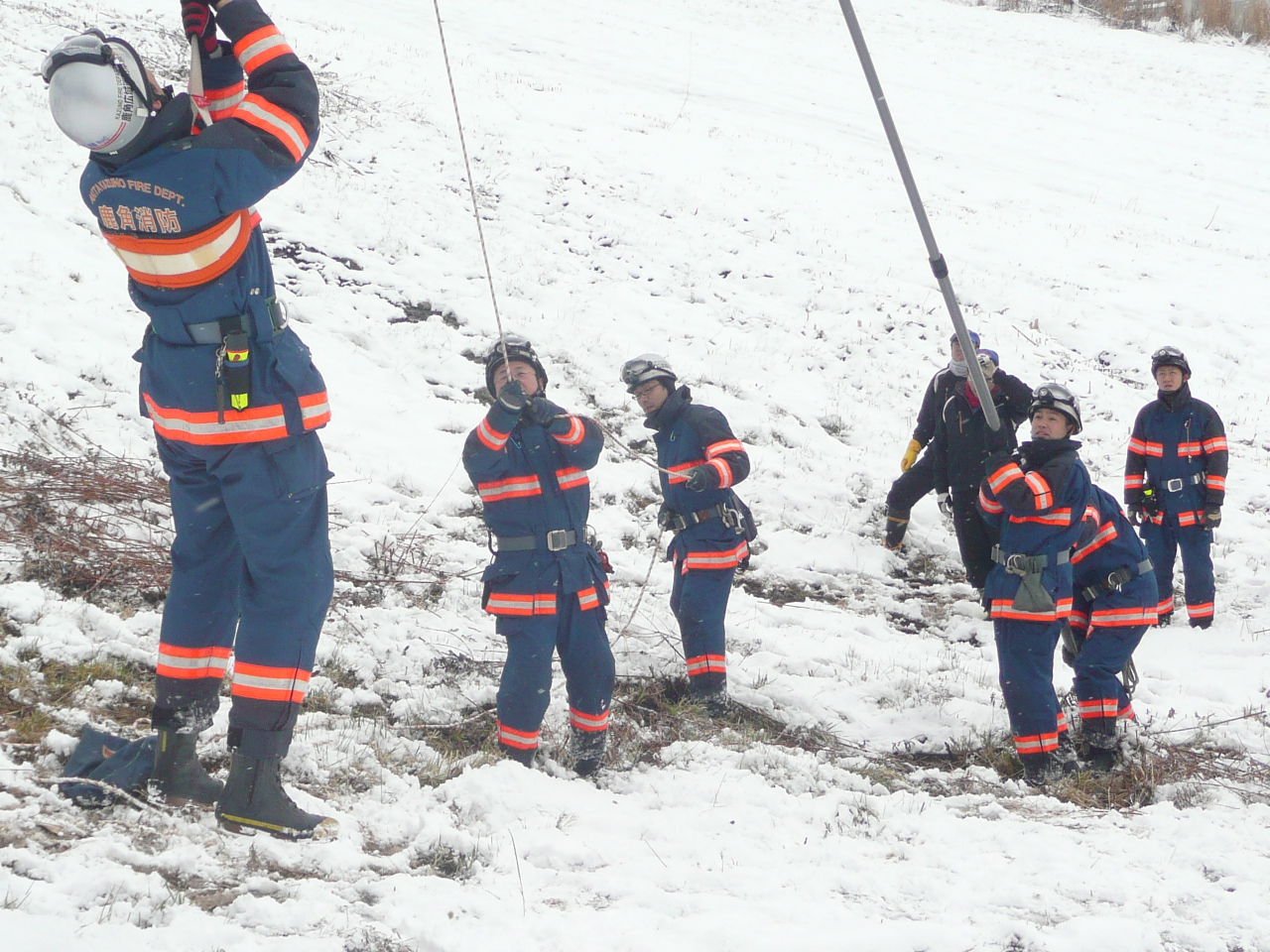 引き続き、鹿角広域消防本部とスキー場職員で、リフト乗車中の救助訓練を行いました。