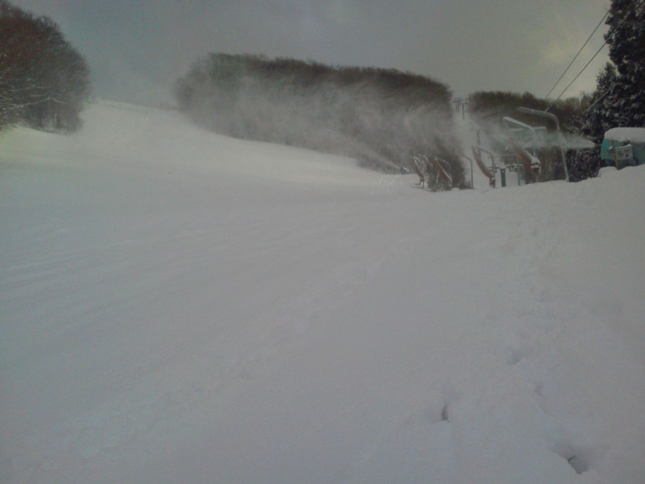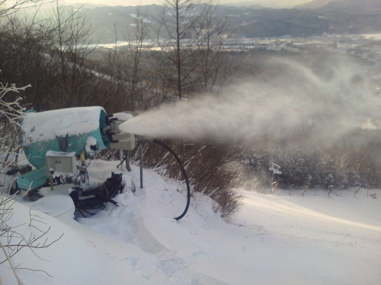 スキー場上部では、人工降雪機による降雪作業が行われています。