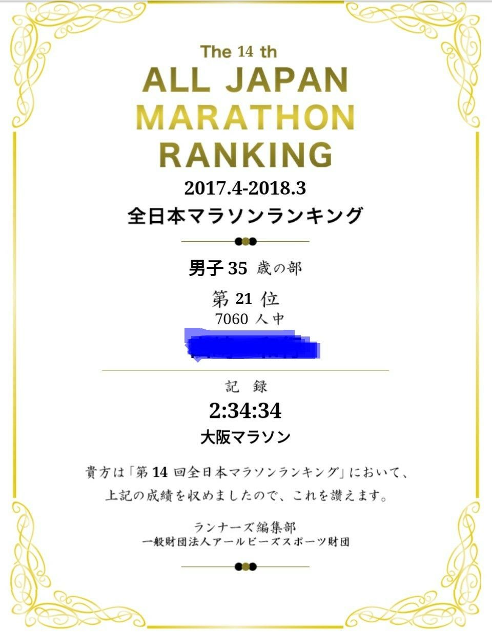 自身4度目の全日本マラソンランキング。