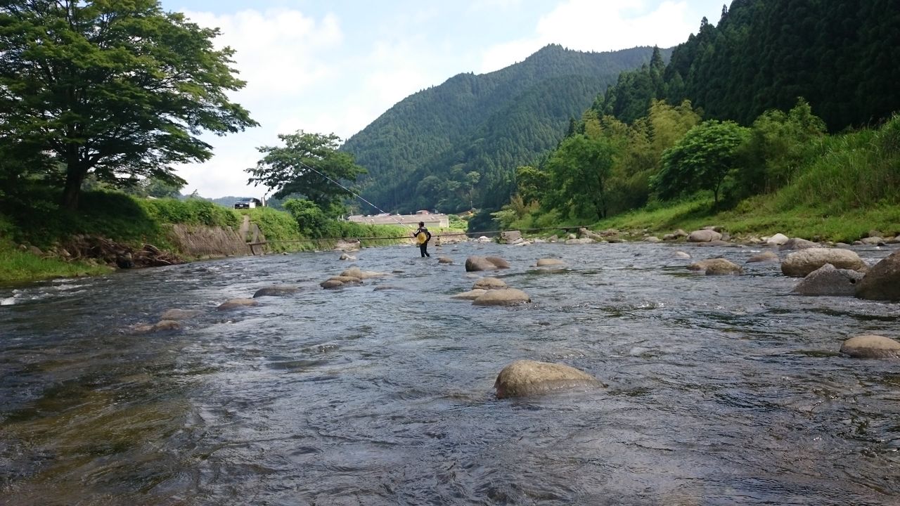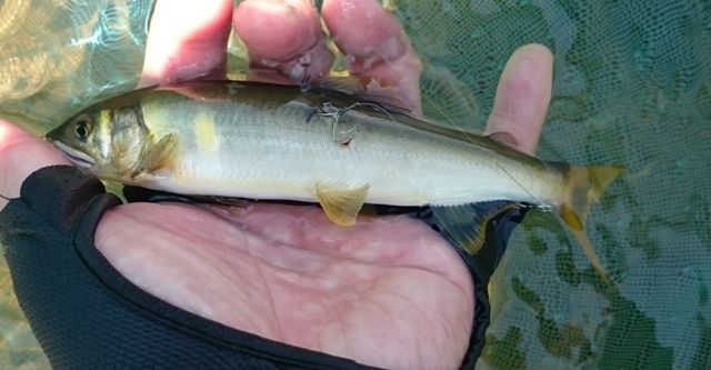 今日は、午前中のみの釣行。水温が17℃と低いので、追いが悪いだろうなあ~と思いながら 、アカが残る石の横を通過させると、幸先良く掛かりました。結果的に今日の最長寸。16cmあるかないか。今年の鮎は、成長が遅れ気味?