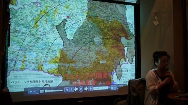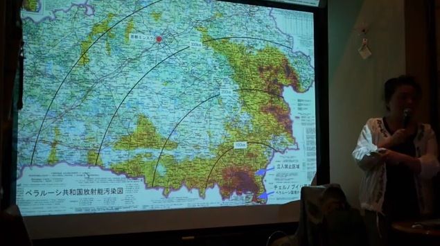 ただこの地図が国民に公開されたのは、事故から3年後です。いろんな困難があって公開されました。それまでは、その担当部署の役人の保身のためだけに隠されていたんですね。失脚したくないとか、事故を小さく見せたいとか、ね、そういう事で国民に発表されませんでした。だからここの地域の子供達は、ここはゾーンで移住させられましたけど、あのー強制移住されなかった汚染地帯の人は、何も知らないで汚染されたものをずっと食べ続けていました」