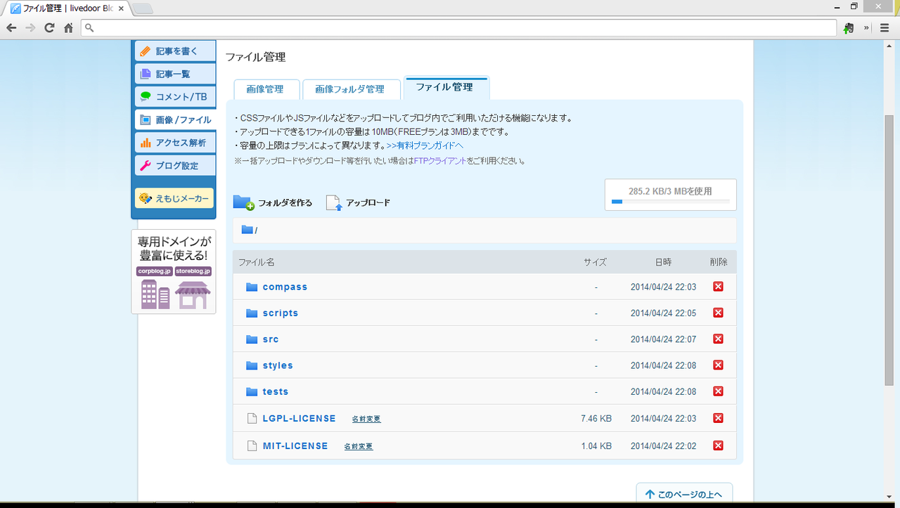 3.zipを解答したらtestsフォルダとindex.html以外をフォルダ構造を守りつつlivedoorブログの「画像/ファイル」→「ファイル管理」タブにそのまま入れてしまう。たぶんもっとフォルダを分けたほうが後々管理しやすい。