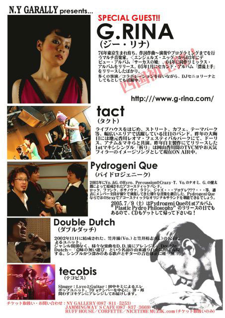 来る7月9日、香川県高松市は北浜の〈NY GALLERY〉にてアコースティック・ライヴ・イベントを開催します!! 初夏の夕暮れ時にビール片手に焼きうどん、そしてアコースティック・ライブ! そんなゆったりとした楽しい時間を満喫できるイベントです!今回はスペシャル・ゲストとして、東京から、少し前にリリースされたセカンド・アルバム『漂流上手』が超大好評な“G.RINA”を向かえてお贈りいたします! その他にも、岡山、香川から選りすぐりのアコースティック・アーティストがこの日オンリー仕様にて出演いたします。お誘い合わせの上、是非是非、お越しくださいませ!