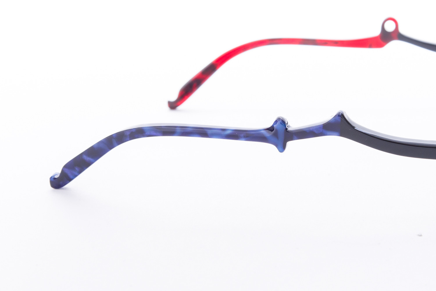 まずはぬえモデル。左右非対称の形状、赤と青のテンプルは特徴的な眼鏡ですね。