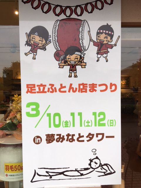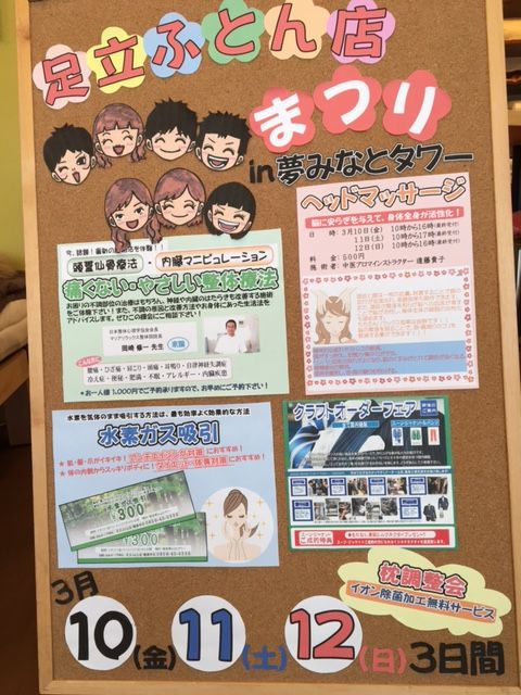 2017年02月21日 来月のイベント 春の足立ふとん店まつり by anminzoku 来月10日 金曜日から始まる 春の足立ふとん店まつり 楽しい企画が盛りだくさん(⌒▽⌒)です 眠りを改善したいかた オーダー枕が気になっているかた ふとんのか買い替えを検討中のかた ぜひ お出かけ下さいませ お問い合わせ 境港本店 0859 45 0336