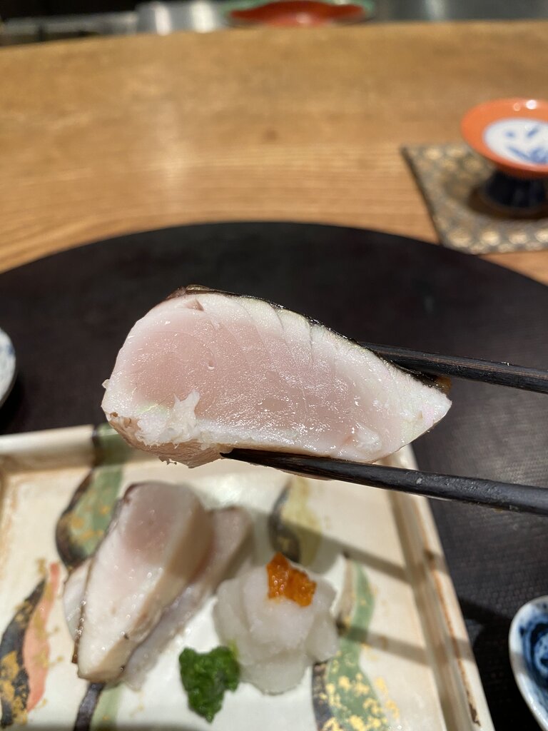 〆鯖みたいに酢で〆て炙ってあります。