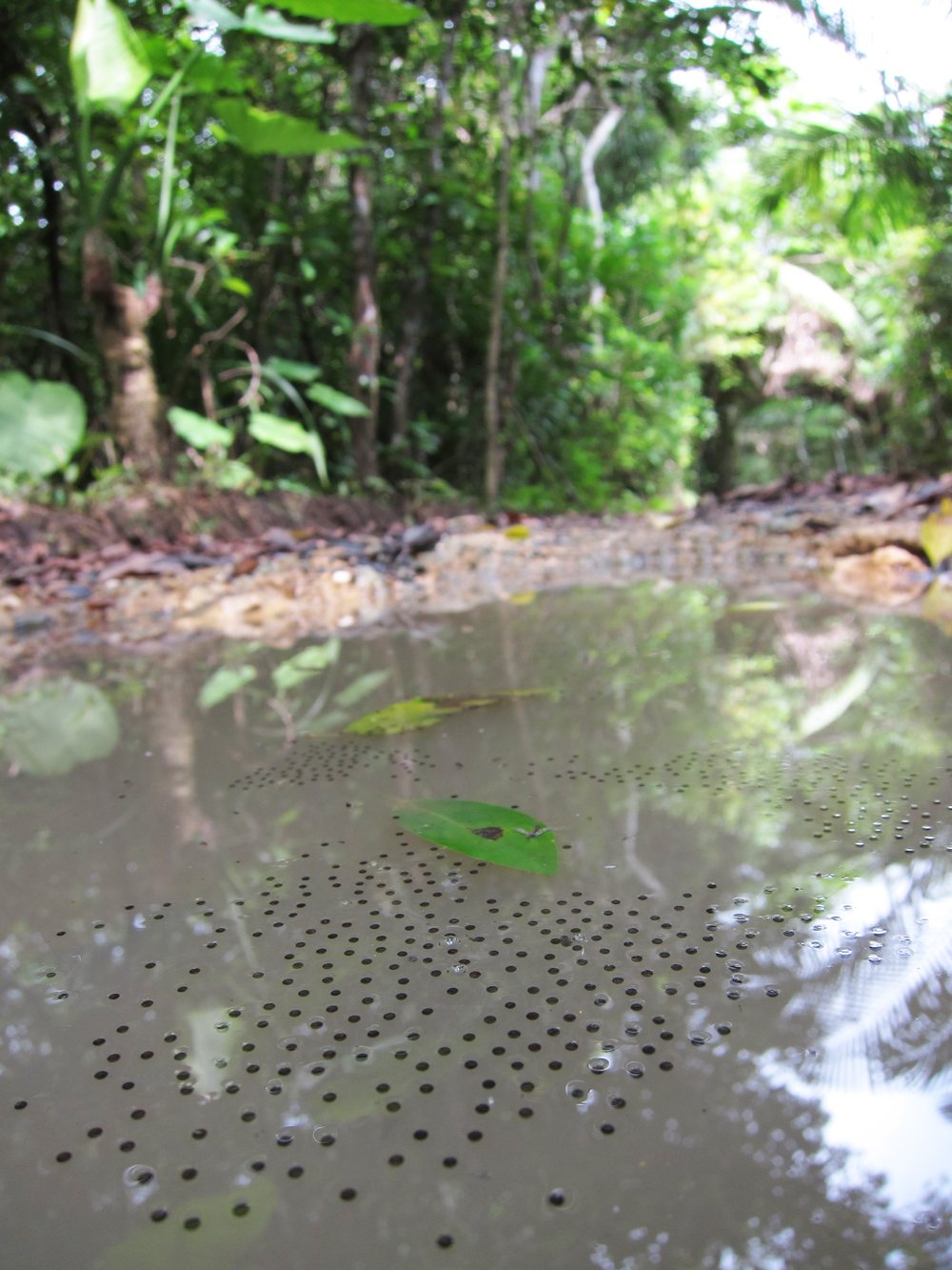 林道にできた、わずかな水たまりにもたくさんの生き物が暮らしています。
