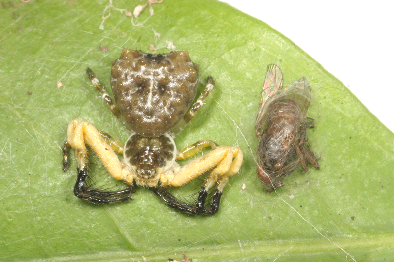 このクモは同じ場所で、獲物を待ち伏せするのでしょう、すぐ隣には、捕食した後のハエとクモが糸で張り付けられていました。