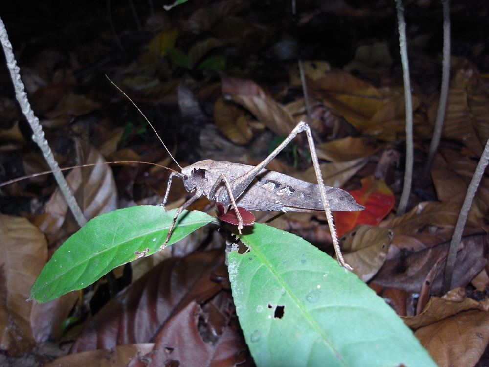 コバネコロギスは、夜に樹上を徘徊して、小昆虫を捕食する肉食バッタです。