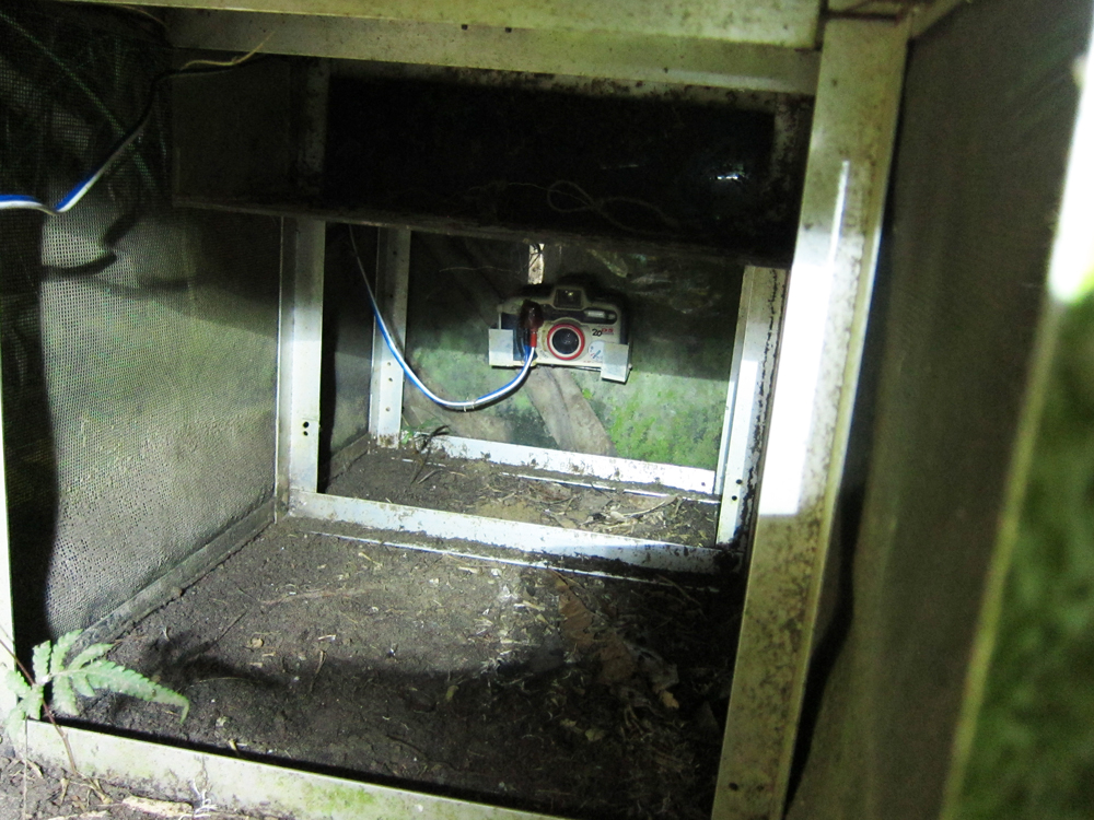 中は2段式になっていて、上段にはヒヨコを入れて、それを食べにきたヤマネコを自動撮影カメラで撮影します。