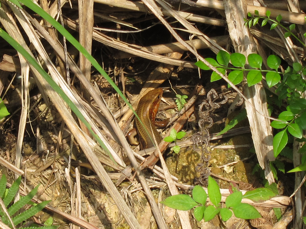 歩き始めて数分で、茂みでガザガザと大きな音がして、よく見ていると、巨大なキシノウエトカゲが現れました!最大で40cmにもなる日本最大のトカゲです。