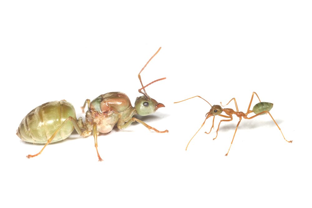 アジア、アフリカ、オーストラリアに分布していますが、アジアとアフリカのツムギアリは、女王は緑ですが、働きアリは茶色です。