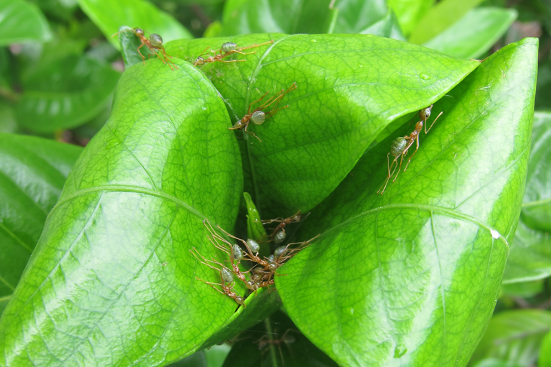そして、糸付け係りのアリが、幼虫を使って葉を繋ぎ合わせるのです。