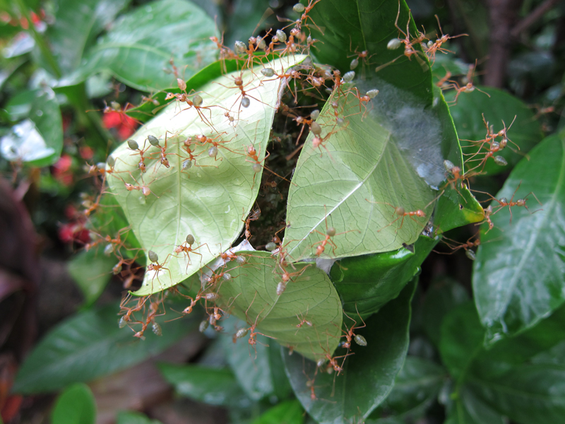 ツムギアリは樹上に巣を作るアリで、幼虫が吐き出す糸で葉を紡いで巣を作ります。