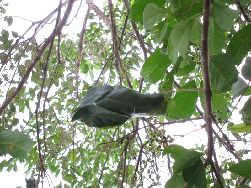 これが樹上に作られたツムギアリの巣です。生息地では、公園から森林まで幅広い環境で暮らしていて、低い木から、10m以上の高い木にまで巣があります。