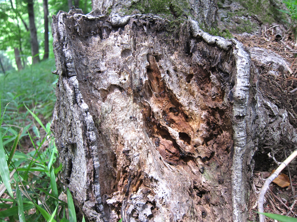 トゲアリはクヌギやコナラ、杉や松などの根元付近にできた樹洞や朽ちた部分で暮らしています。