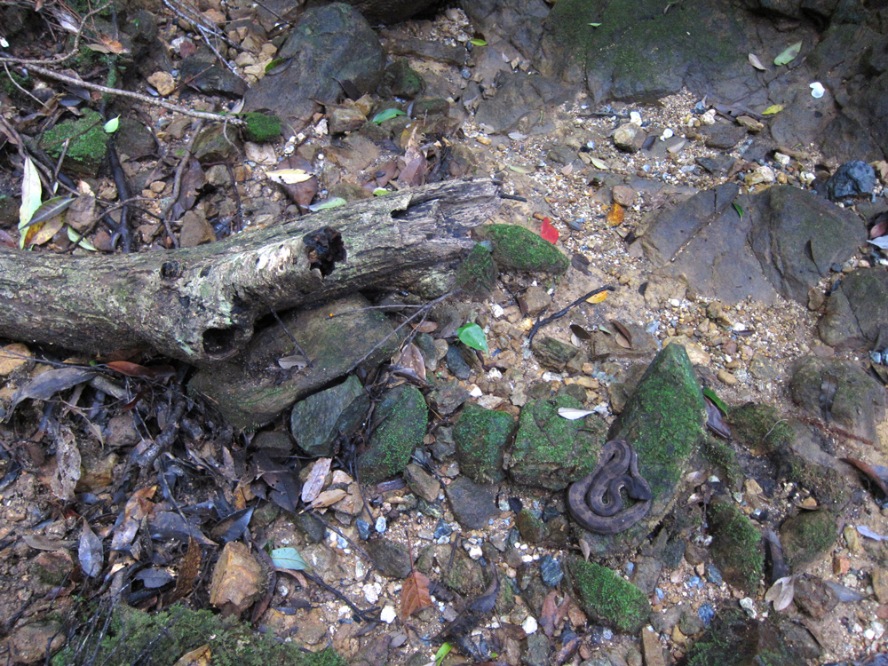 沢沿いにはヒメハブがいました。昼間でも暗い森の中では、ハブも活動していることがあるので気をつけなければいけません。