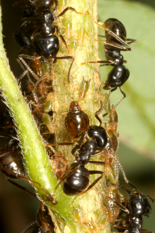 木に登っているアリたちは、樹液を集めたり、アブラムシやカイガラムシから甘露をもらったりしています。