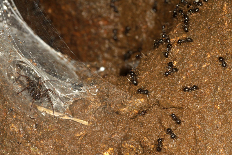 クサアリの巣の入り口付近には、クモが巣を張ってアリを狙っています。
