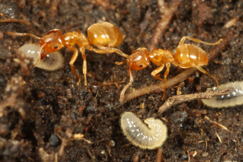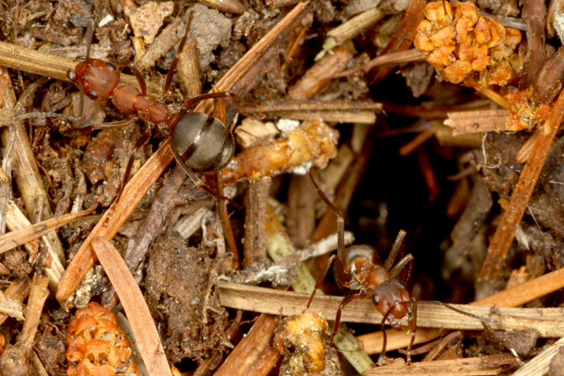 クロヤマアリを奴隷狩りをして、2種類が一緒に暮らす巣もありますが、大きなコロニーで奴隷狩りを行わずに、アカヤマアリのみで暮らしているコロニーもありました。