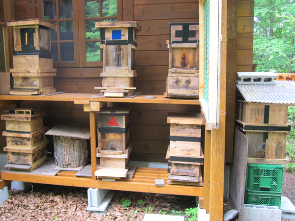 そして、家の前で飼育をしているニホンミツバチですが、今年は新たに巣が増えたようで、たくさんの巣箱にハチが入っていました。