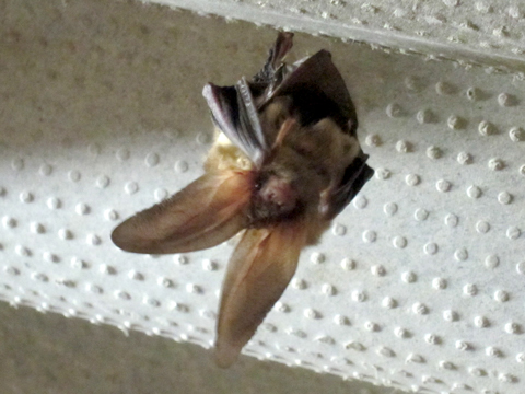 そして「数日前に倉庫にコウモリがいた」と聞き、その場所に案内してもらいました。倉庫の2階に上がると、天井にコウモリがいました。