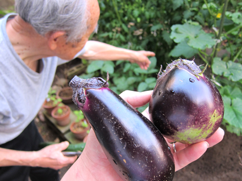 山での採集を終えた後は、長野に住む、妻の祖父の家に泊まりに行きました。自宅の庭では、盆栽や菊、キュウリ、ナス、トウモロコシ、ネギなど様々な植物を栽培していました。