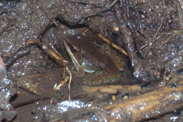 ヒバアが生息する川を歩いていると、ヤエヤマハラブチガエルが穴の中で鳴いていました。
