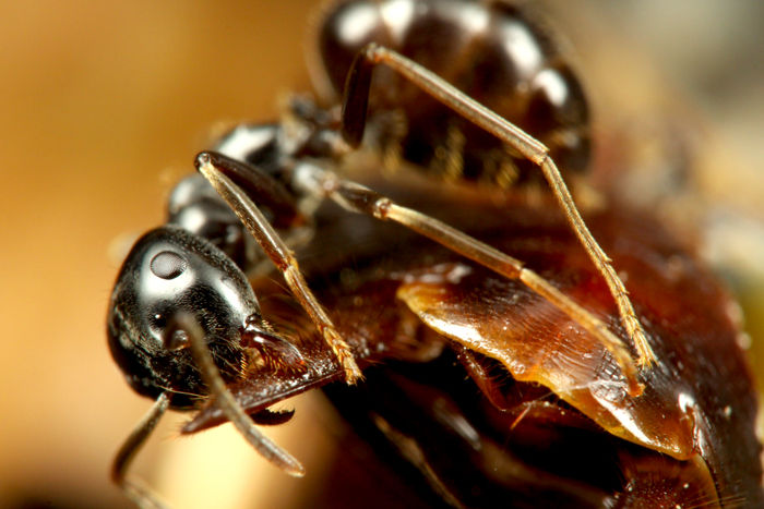 死んだゴキブリを見つけた働きアリ。