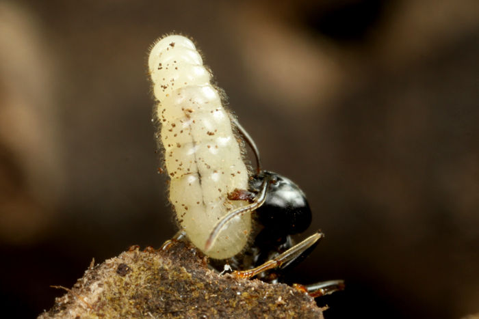 幼虫を運ぶ働きアリ。