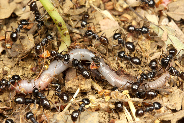 ミミズを見つけると集団で襲い掛かり、動かなくなったら石や枯葉などを乗せて隠します。