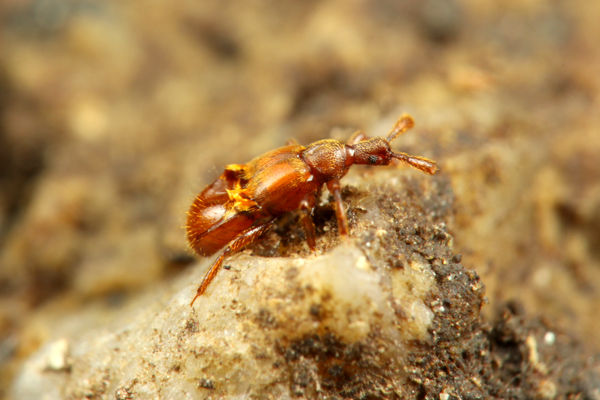右:ケアリの巣から見つかったヒゲブトアリヅカムシの一種。