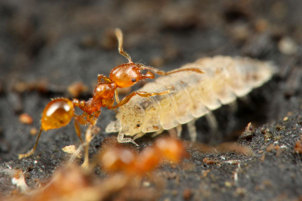 左:アズマオオズアリの巣の中には、多くの小型ワラジムシが同居をしていました。