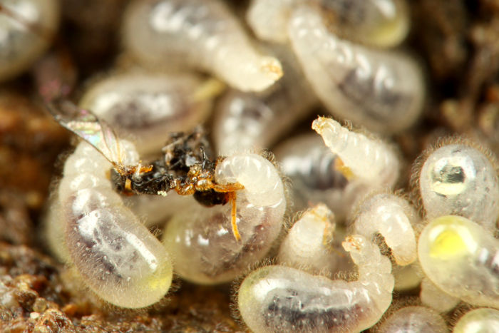 幼虫が、働きアリが集めてきた昆虫を食べています。
