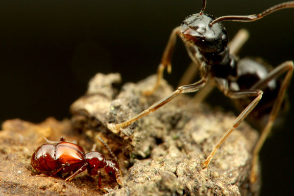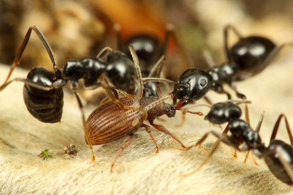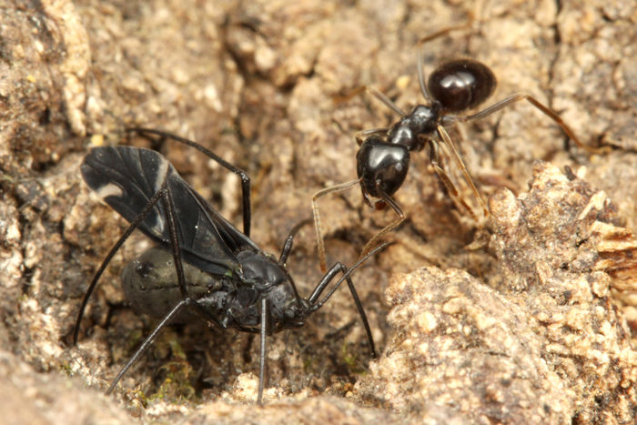 このハネカクシは、アリが見つけたエサを盗み食いしたりしますが、時にはアリを襲うこともあります。