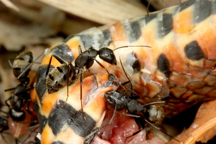 左:死んだジムグリを食べているクロオオアリ。