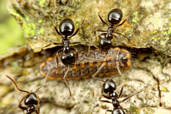 アリの巣には入りませんが、ムモンアカシジミの幼虫は、木の幹や枝でクサアリ類に守られながら、木の葉や、クサアリが守っているアブラムシを食べて成長するのです。