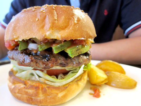 巨大なハンバーガーには、肉やアボガドたっぷりです。
