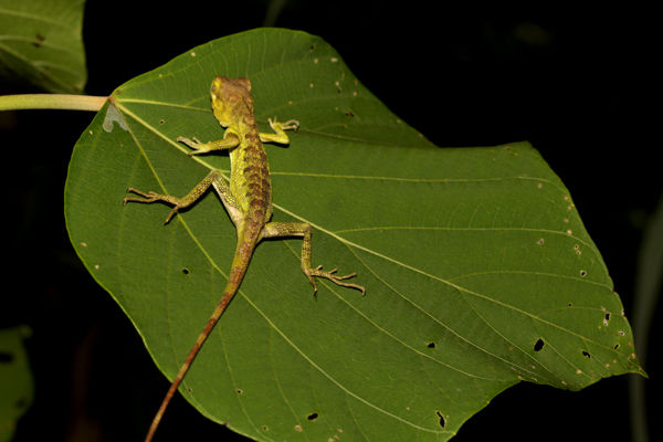 写真右:葉の上で眠るサキシマキノボリトカゲ