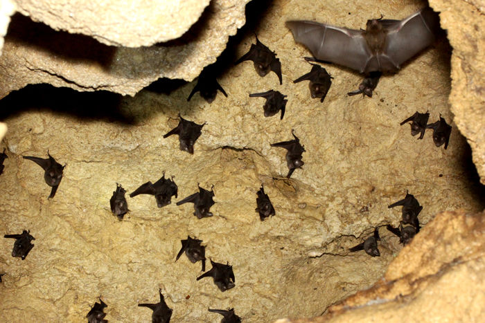 洞窟内にコウモリの糞が溜まっている場所があり、その上を見ると大型なカグラコウモリが群れていました。