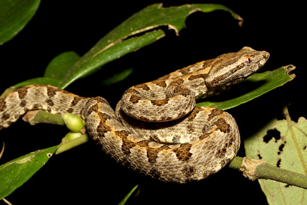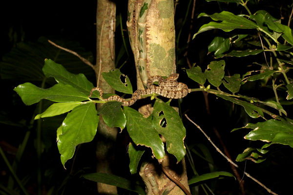 茂みの中を歩いていると、目線ほどの高さの葉の上にサキシマハブがいたのです!