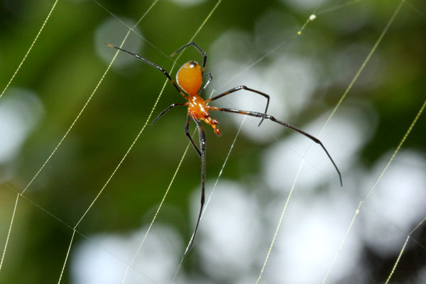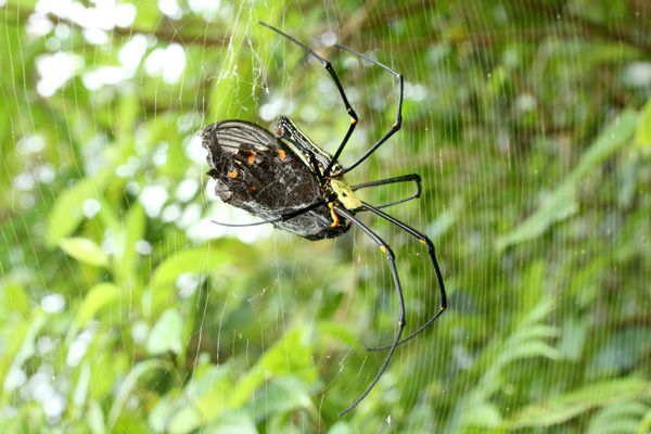 茂みを歩いていると、顔にクモの巣が付くことが頻繁にありますが、小型種の場合はそのまま気にせず歩き続けますが、オオジョロウグモの直径1mにも及ぶ巨大な網が顔に付くと、「メリメリ」と音がするほど頑丈で、思わす後ずさりしてしまうほどです。