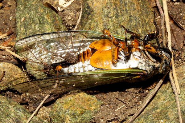 写真左:死んだクマゼミを食べる、掃除屋のザトウムシ