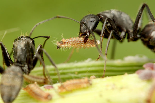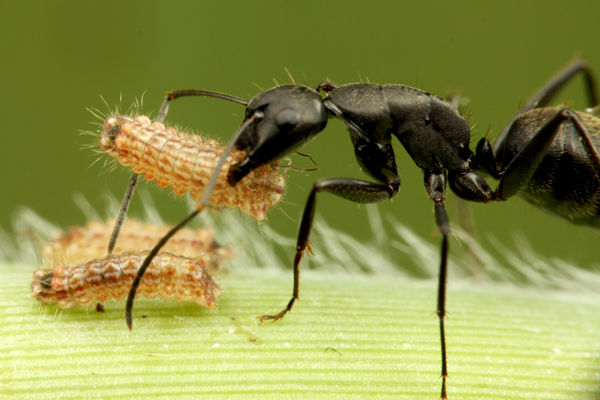 クロシジミと、クロオオアリの関係が徐々にでき始めると、続いてクロオオアリが驚くべき行動をとります。