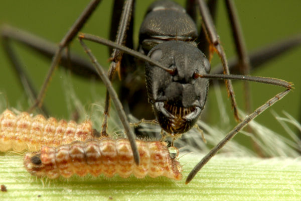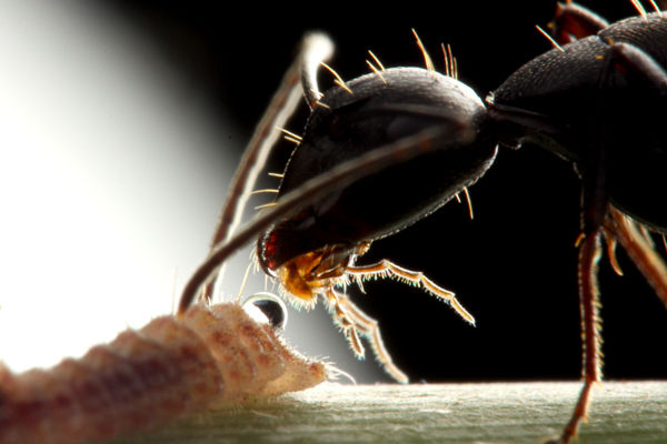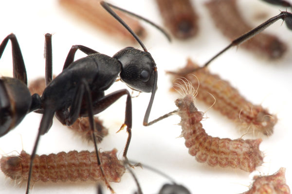 この写真だけ見たら、アリが芋虫を食べるために運んでいるように見えますが、食べるためではなく、巣の中で育てるために運んでいるのです。