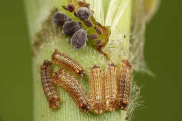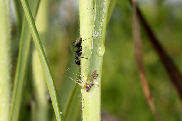 ススキの葉の根元にはアブラムシがいて、アブラムシから甘露をもらおうとしているクロオオアリと、クロシジミの幼虫がいます。