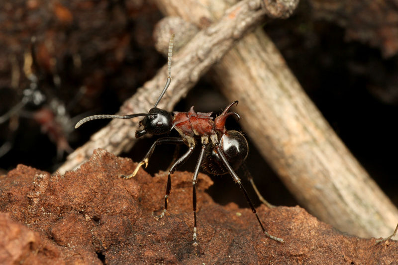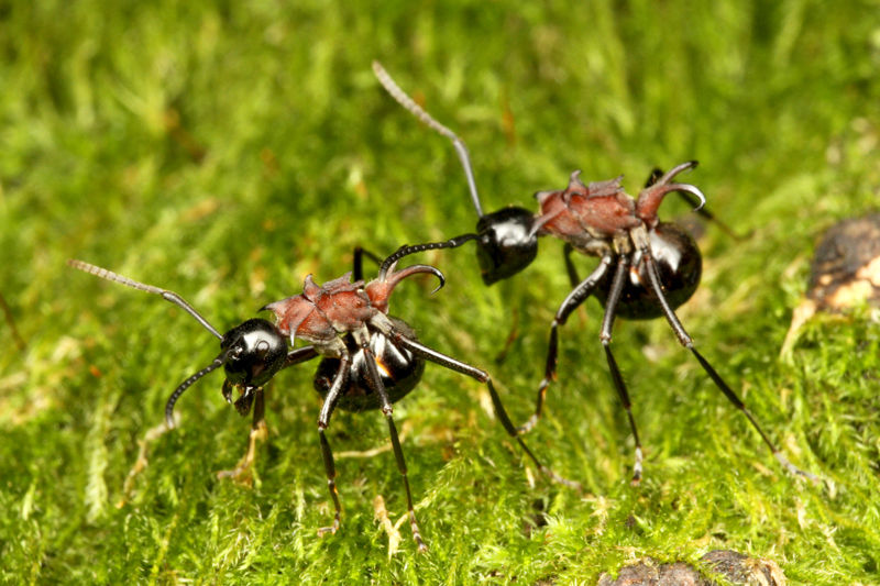 自分よりもはるかに大きなクロオオアリ女王を襲うトゲアリ。
