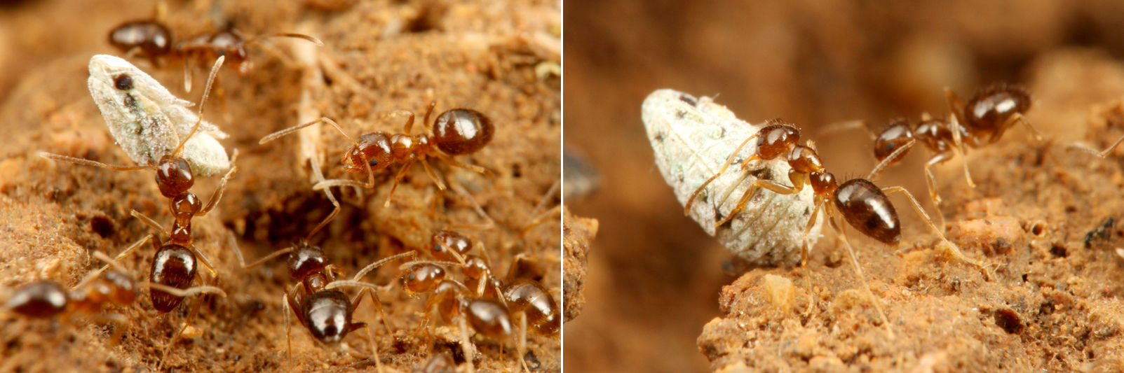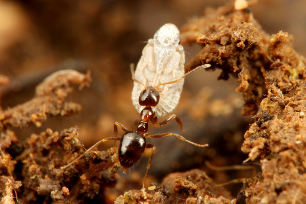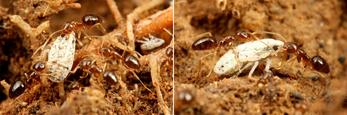 危険が迫ると、働きアリたちはウンカを安全な場所に運びます。