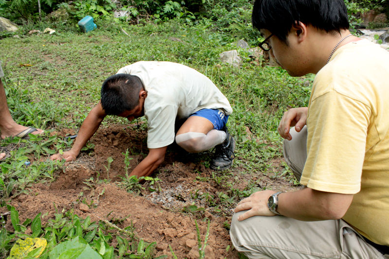 ホセさんが突然、小屋近くの地面を素手で掘り始めました。