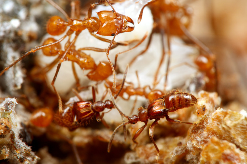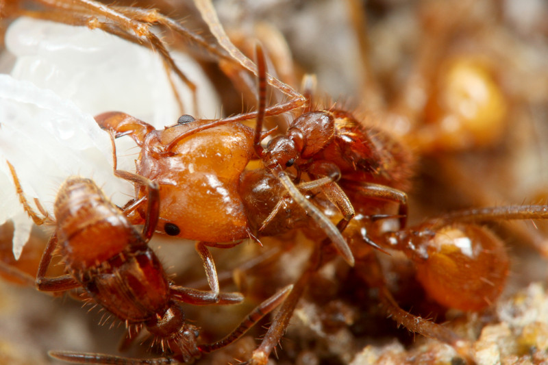 大型兵隊アリのサナギを守ろうとする働きアリたち。